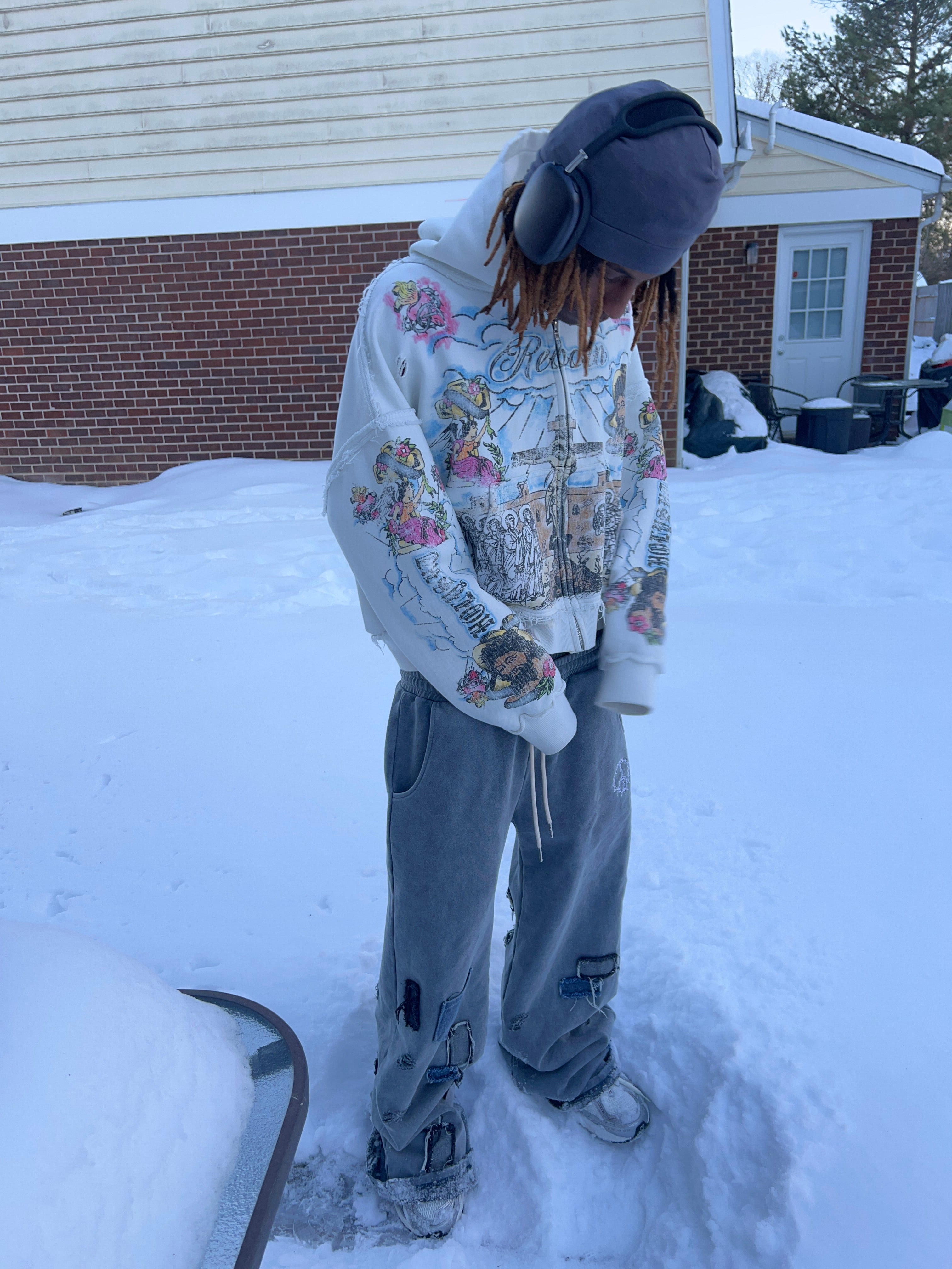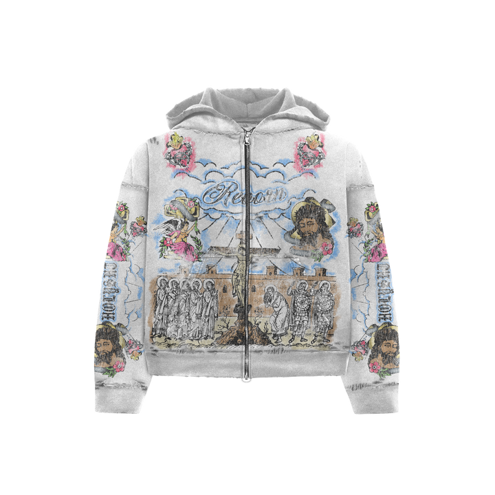 “Holy” distressed zip